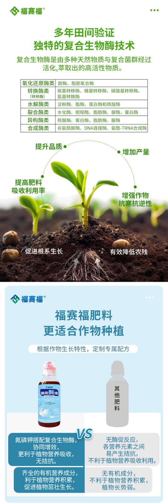 依托自主高新技術—復合生物酶技術緊隨國家綠色高品質農業(yè)發(fā)展政策和農產品市場消費升級趨勢福賽集團注冊成立河北福賽農業(yè)科技有限公司,以確保糧食果蔬健康為核心,以節(jié)肥增效、減藥控害為研發(fā)方向,聚焦新型有機肥的研發(fā)與生產,為農業(yè)增效,助農民可持續(xù)性增收!截止目前,公司構建了以生物發(fā)酵液體有機肥為核心的產品體系,包括魚蛋白肥系列